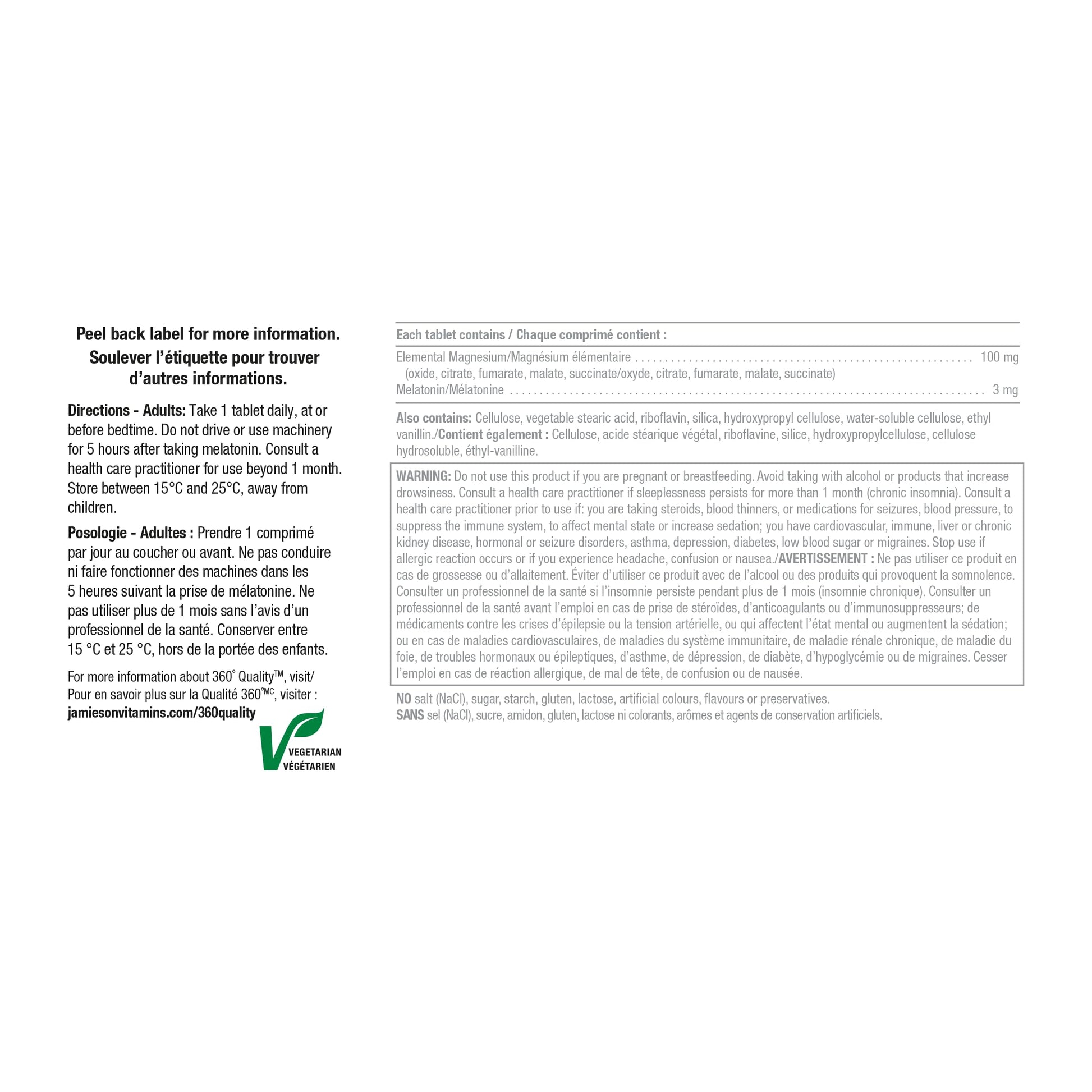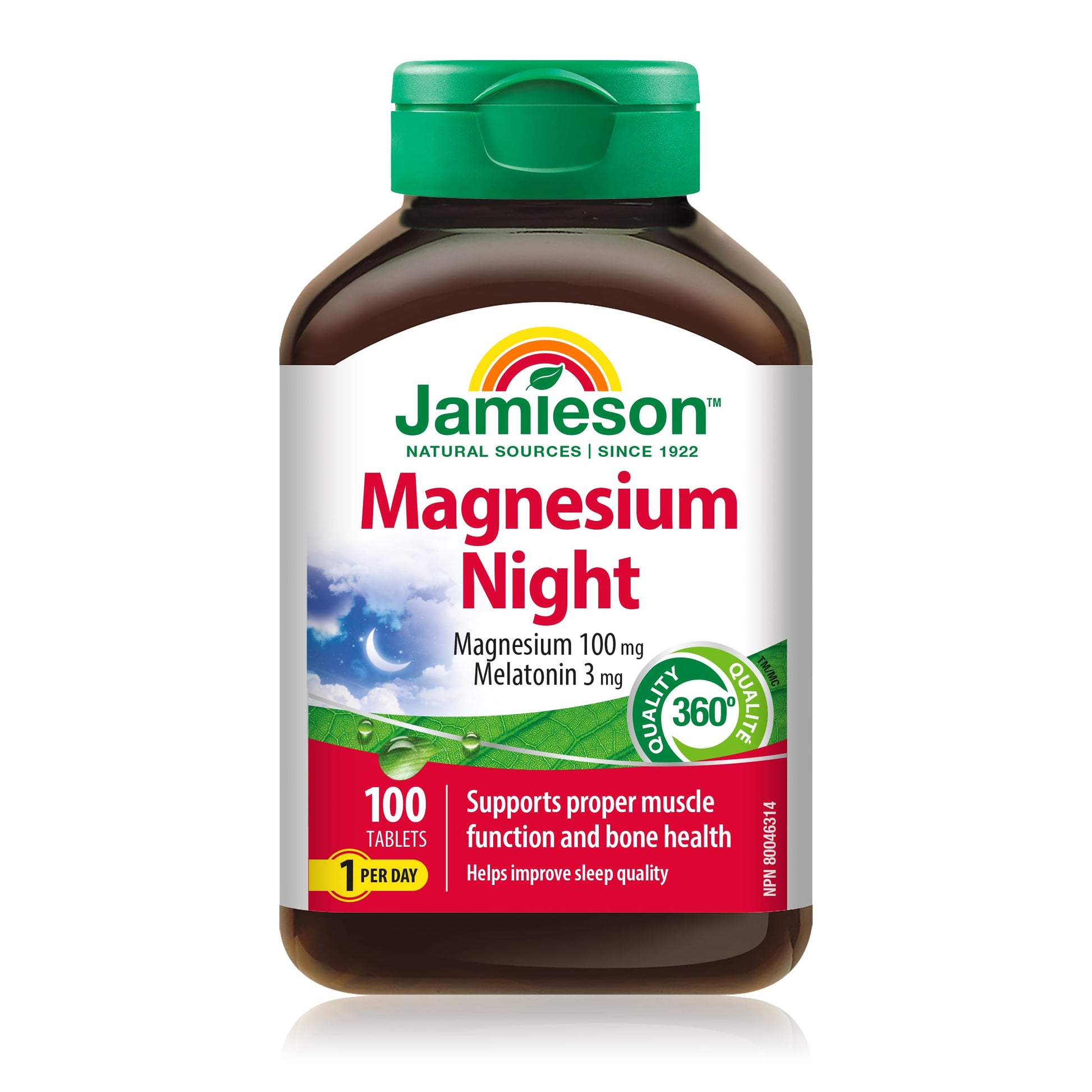 Jamieson Magnesium Night is a simple once-daily nighttime formula combining 100 mg of magnesium with 3 mg of melatonin. This blend is designed to support your evening routine, help maintain your body’s natural sleep-wake rhythm, and provide essential mineral support for bones and muscles.