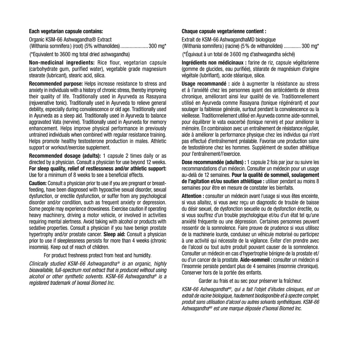 Each capsule delivers: 300 mg of organic ashwagandha root extract (equivalent to 3,600 mg of dried root), standardized to 5% withanolides